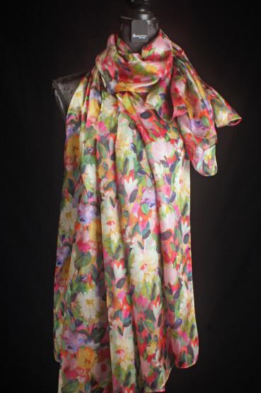 Tauche ein in die fröhliche Leichtigkeit unseres schicken Langschals aus zarter Ponge-Seide! Mit einem frischen, bunten Blumenmotiv, das „Ja“ sagt zum Leben, ist dieser Schal ein wahrer Eye-Catcher. Die lebendigen Farben und das verspielte Blumenmuster verleihen deinem Look einen Hauch von Lebensfreude und Optimismus