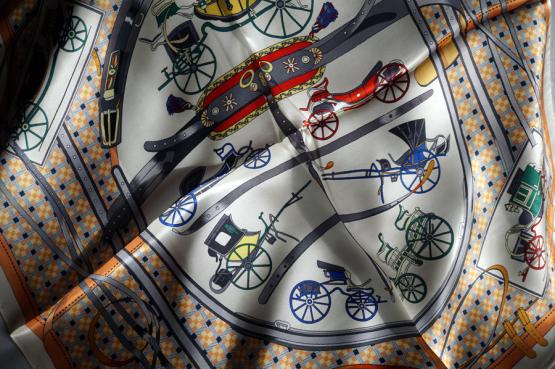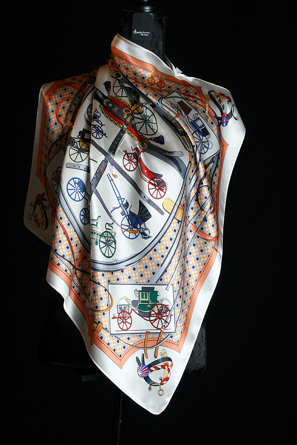 Quadratisches Seidentuch aus feiner Satinseide — zarte, edle Farben und ein elegantes Motiv mit stilisierten Pferdekutschen. Angenehm weich auf der Haut, mit geschmeidigem Fall und luxuriösem Glanz. Ein klassischer Hingucker, der jedem Outfit sofort aristokratische Raffinesse verleiht.